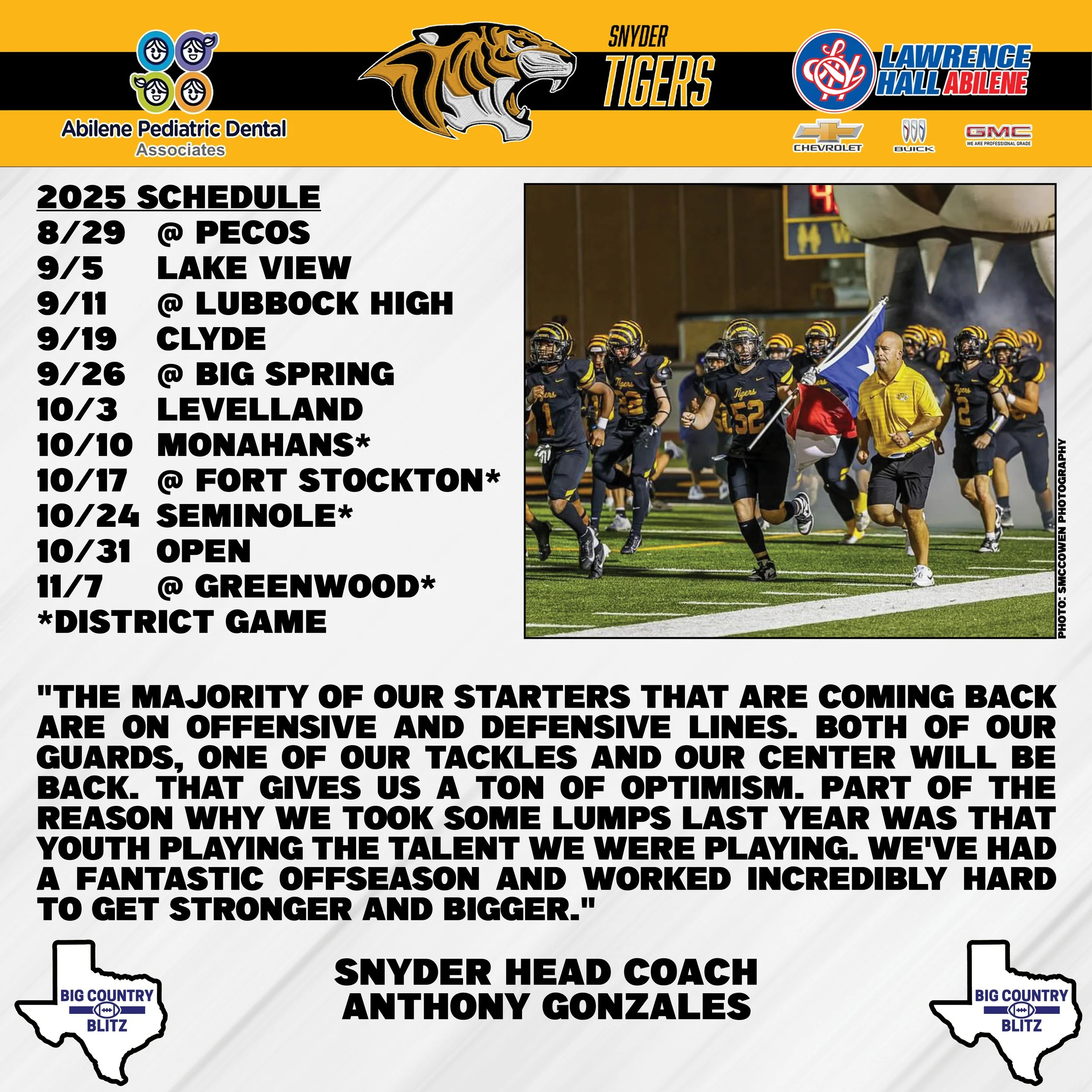 2025 Snyder Tigers Jun 3 Written By Cody Coil Snyder will be tough in the trenches as the Tigers look to reach a new level in year two under head coach Anthony Gonazales. Cody Coil