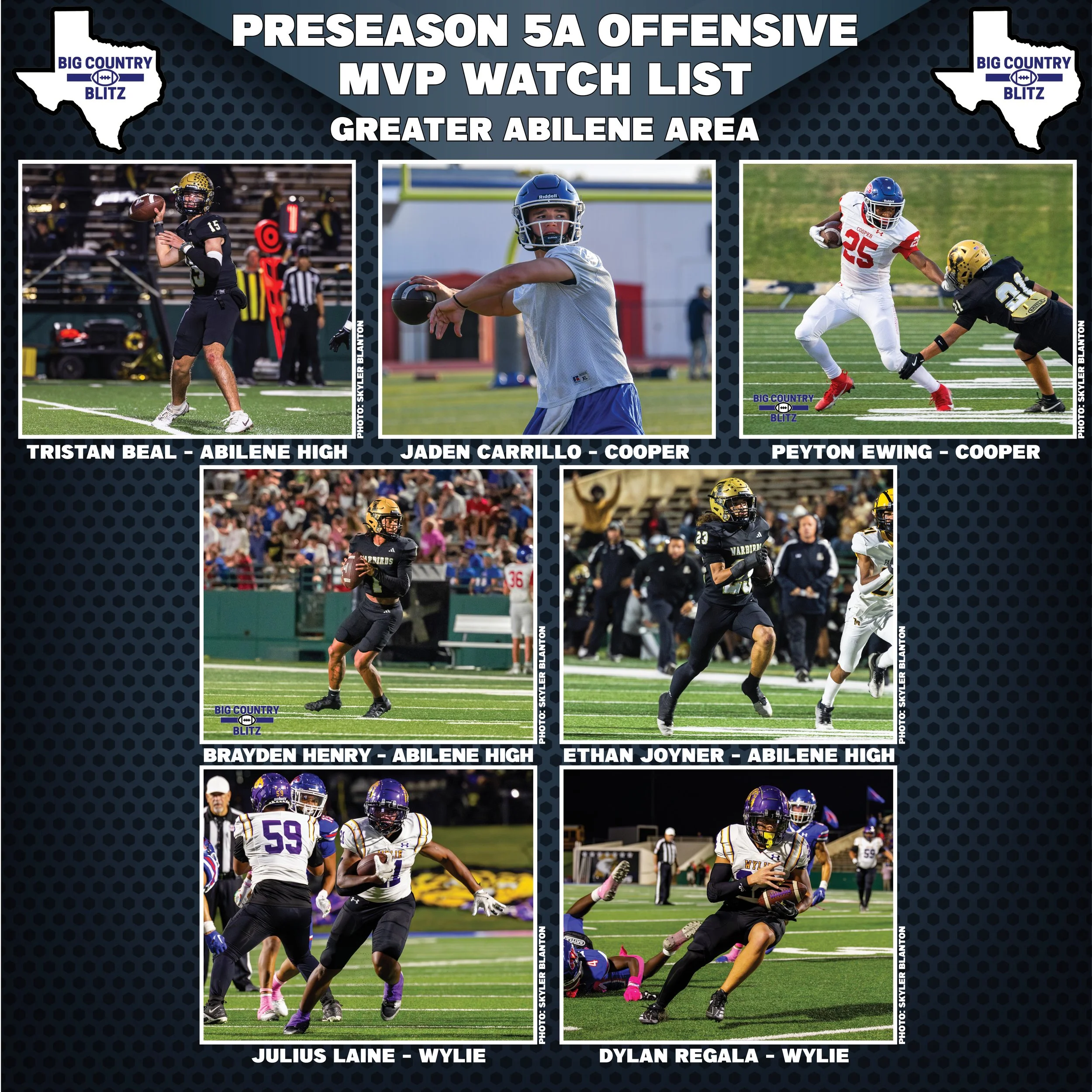 𝗕𝗜𝗚 𝗖𝗢𝗨𝗡𝗧𝗥𝗬 𝗕𝗟𝗜𝗧𝗭 𝟱𝗔 𝗣𝗥𝗘𝗦𝗘𝗔𝗦𝗢𝗡 𝗢𝗙𝗙𝗘𝗡𝗦𝗜𝗩𝗘 𝗠𝗩𝗣 𝗪𝗔𝗧𝗖𝗛 𝗟𝗜𝗦𝗧 Aug 17 Written By Cody Coil A look at the candidates to be the best offensive player in the Big Country this season in 5A. Cody Coil