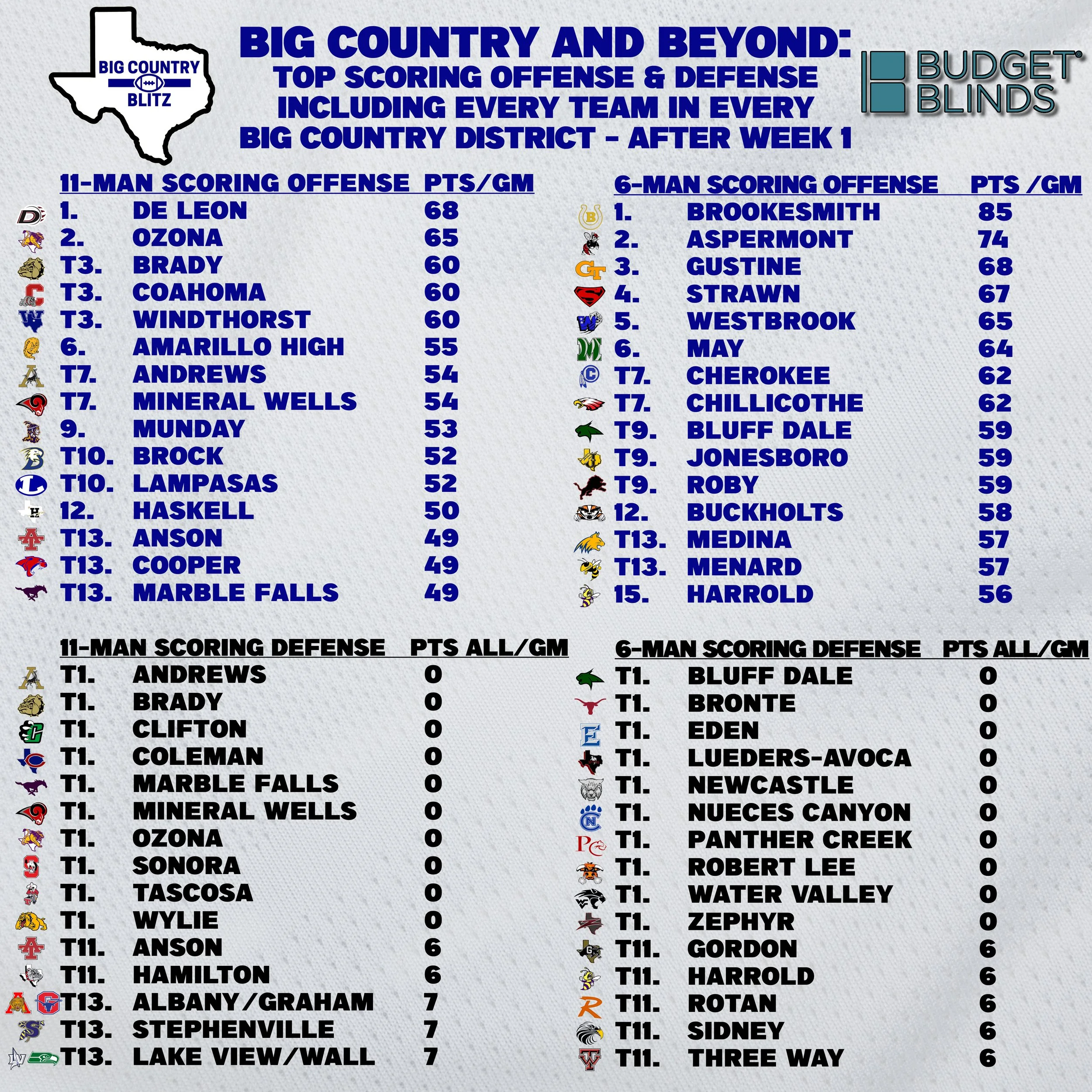 Big Country…And Beyond - Week 1 Sep 1 Written By Cody Coil Here is a look at the offensive and defensive scoring leaders, including every team in every Big Country district. Cody Coil