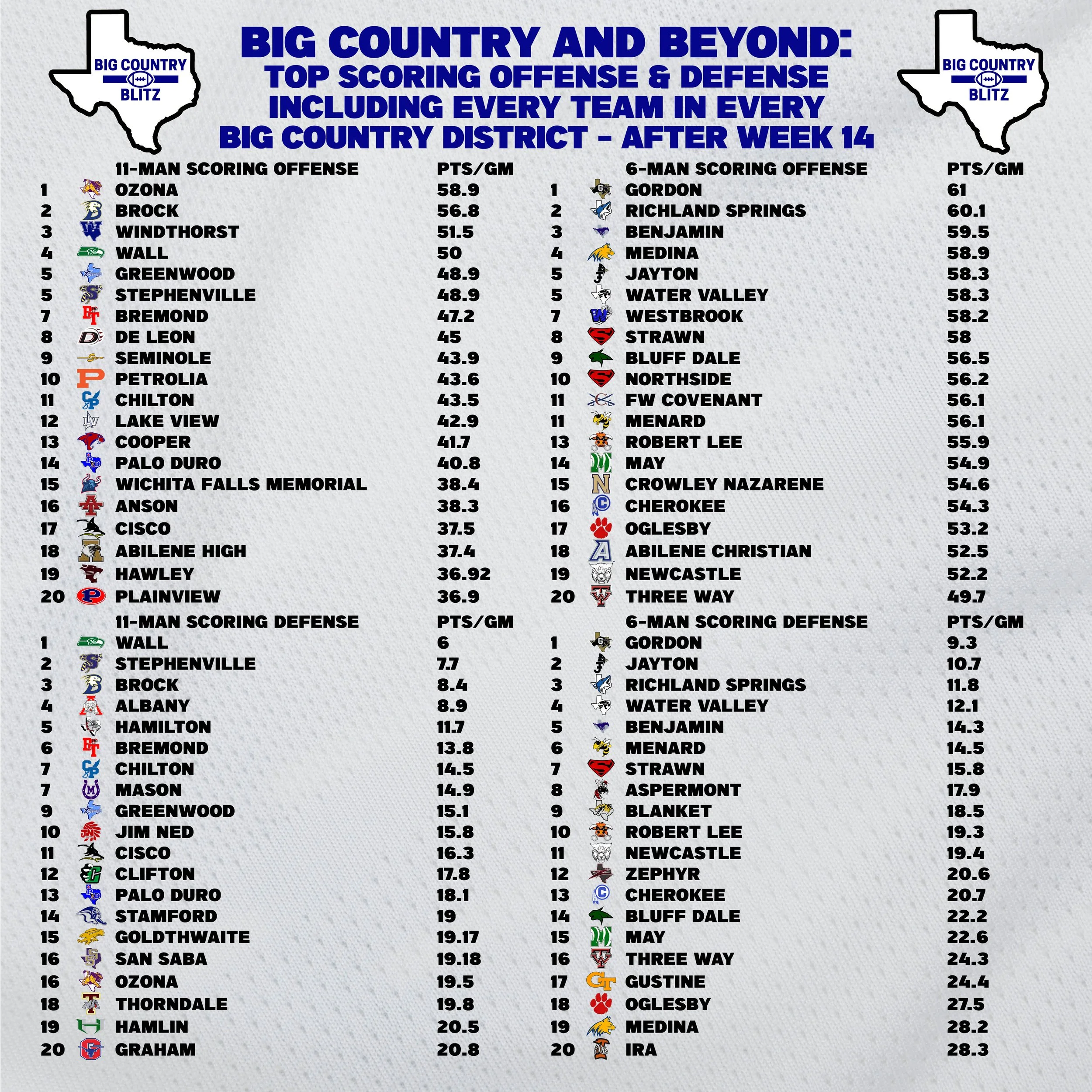 Big Country…And Beyond - Week 14 Dec 2 Written By Cody Coil Here is a look at the offensive and defensive scoring leaders, including every team in every Big Country district. Cody Coil