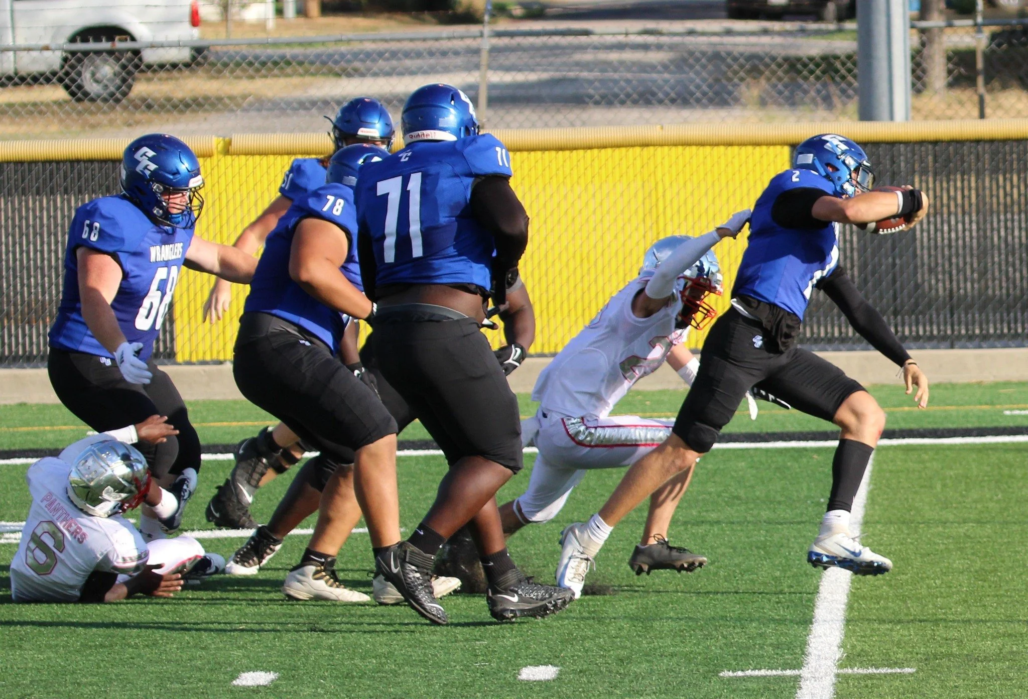 The Wranglers only managed 169 yards of total offense in the loss at Blinn, 91 rushing and 78 passing, and gave up 397. Quarterback Christian Kaopua ran for 101 yards but only completed 6 of 18 passes for 78 yards with a touchdown and an interception.