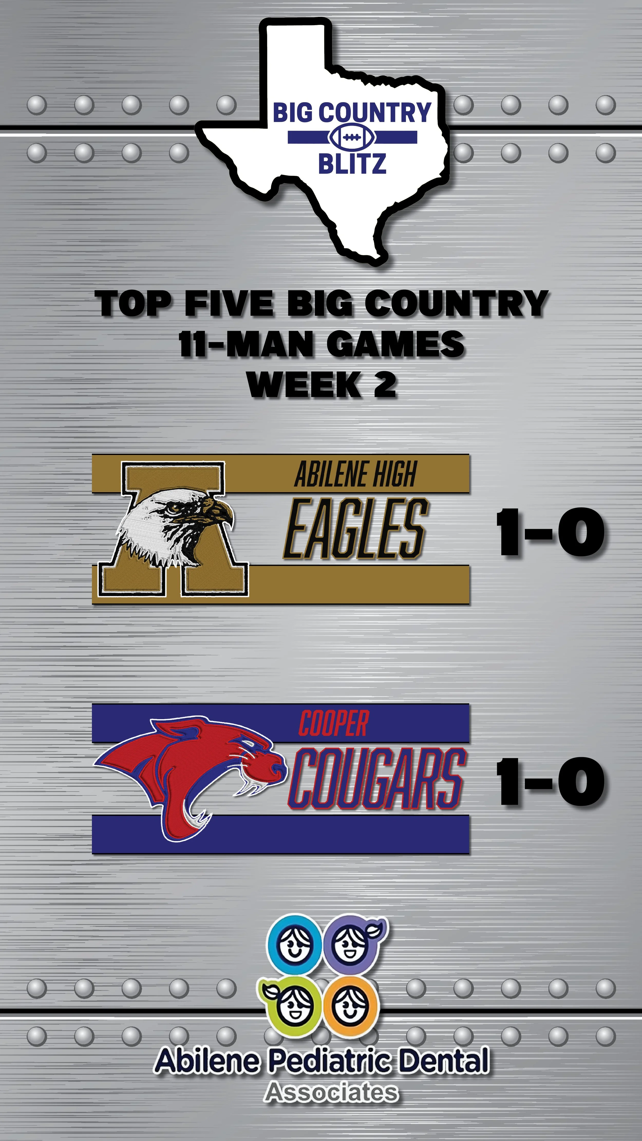 And our top Big Country 11-man game of the week is the 65th edition of the Crosstown Showdown as Abilene High faces Cooper. Both teams are coming off great wins in week one, the Warbirds 42-21 over San Angelo Central and the Cougars 49-25 at Azle. The Coogs turned some heads with their win, but their improved offense will be tested by an improved Abilene High defense that held the 6A Bobcats to under 200 yards last week. The Eagles won a good contest by 9 over Cooper a year ago, and they are the pick to get the job done again and run their winning streak in the series to four.