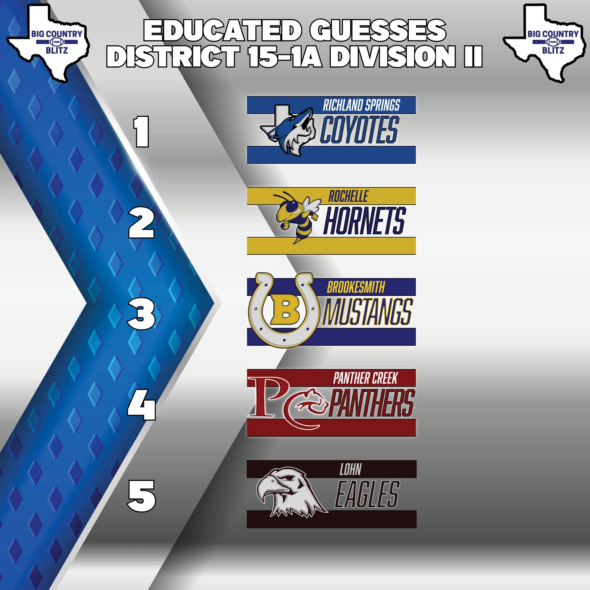 For the record, last season Big Country Blitz got 14 out 15 playoff picks correct in 1A Division II and TAPPS Six-Man Division II.