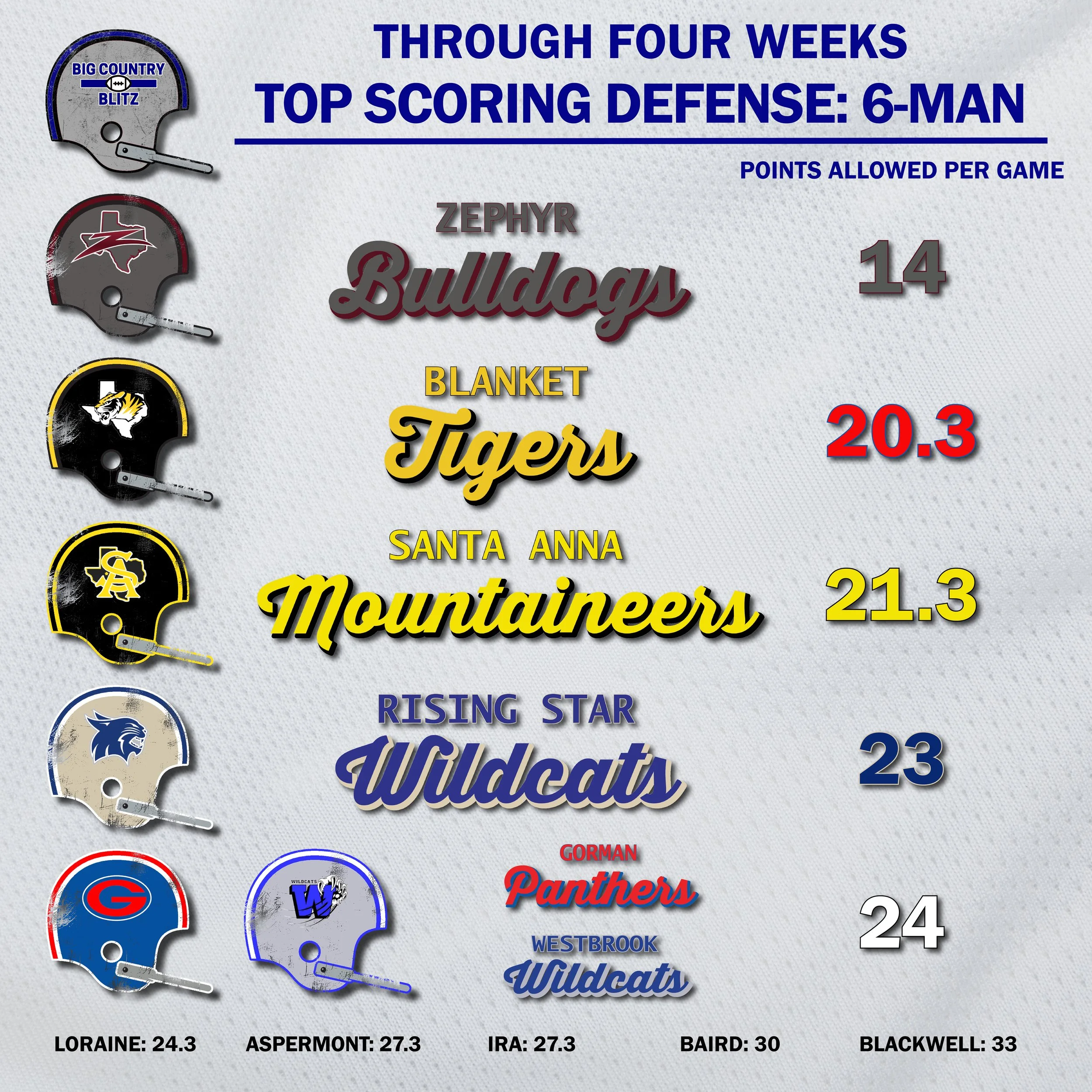 Blanket moves from six to two, Santa Anna stays at three, Rising Star moves from eight to four and Westbrook and Gorman share the number five spot giving up just 24 points per game.