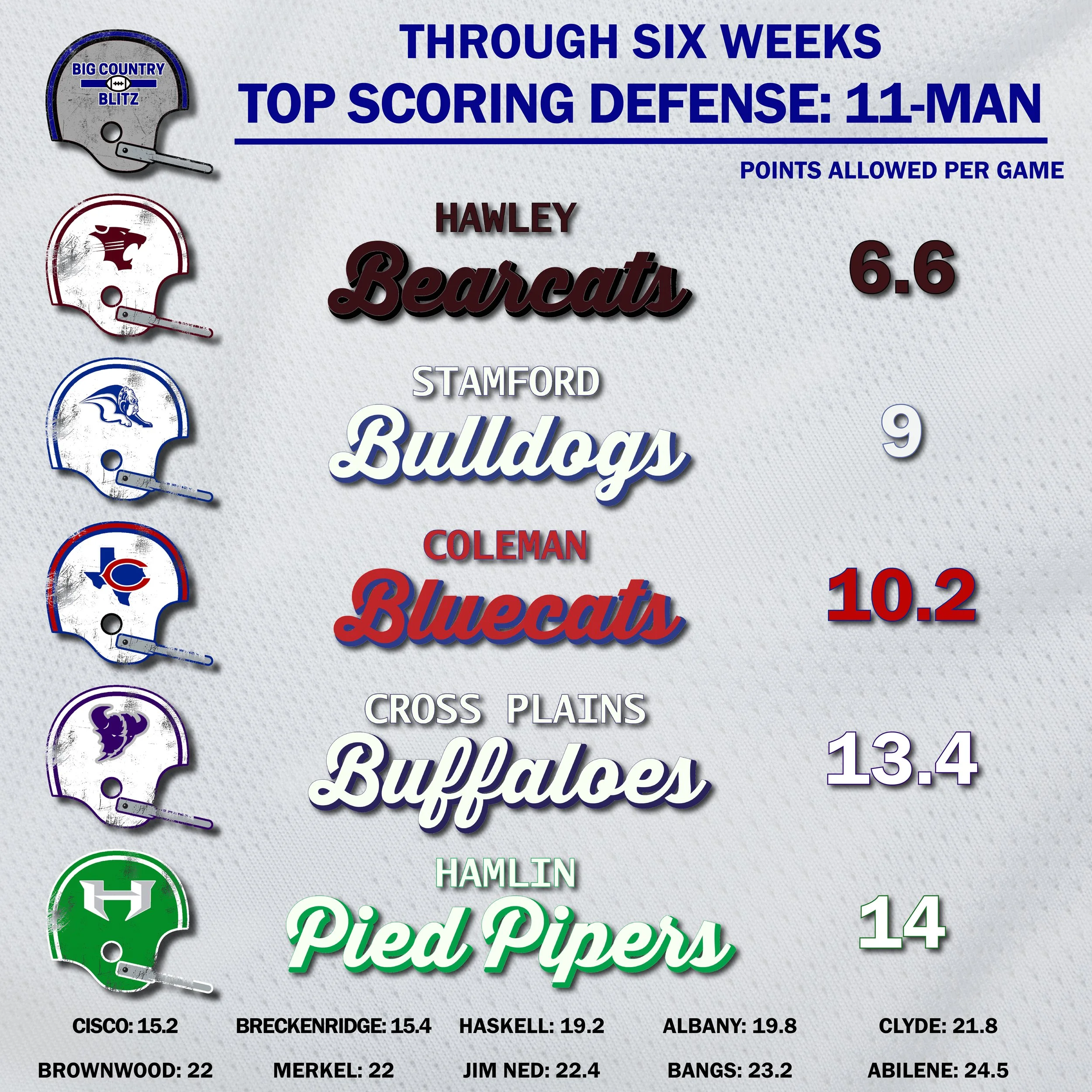 There is no change this week in the pecking order of 11-man Big Country defenses, and Jones County continues to be the center of area defensive excellence with Hawley, Stamford and Hamlin all in the top five.