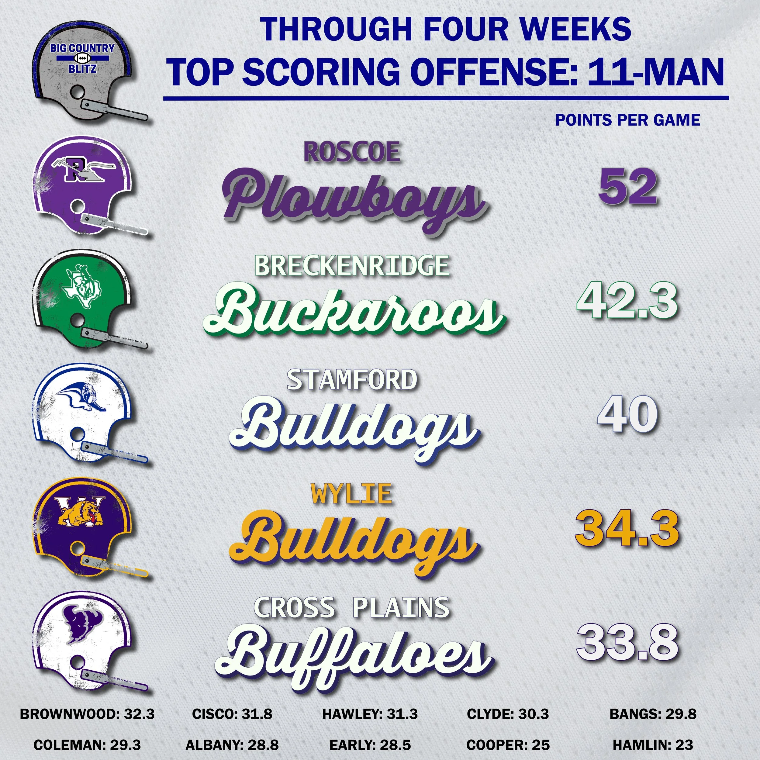 Roscoe finally got back on the field and upped its points-per-game average from 46 to 52 to remain atop the 11-man scoring offense leaderboard after four weeks.