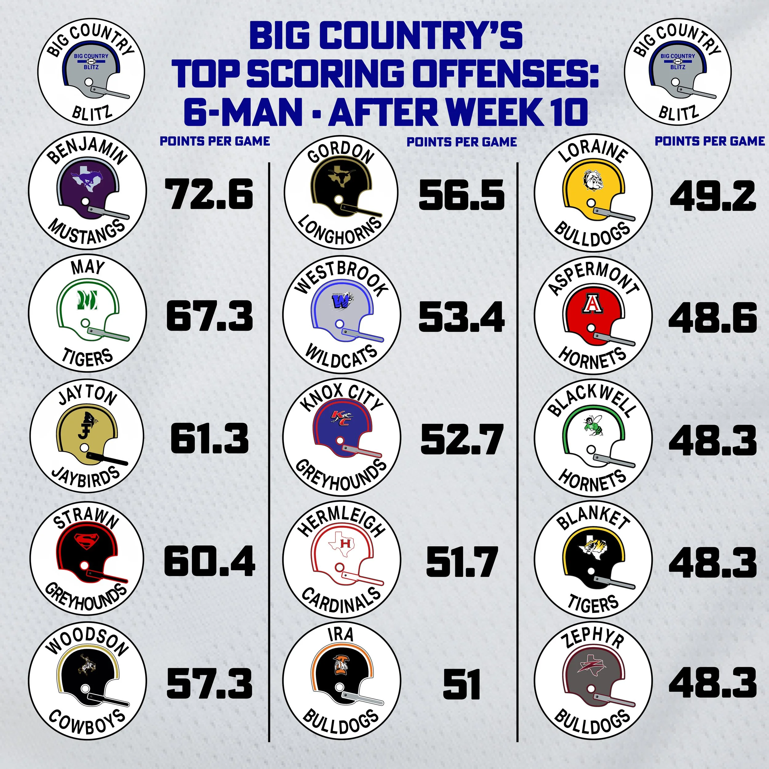 Top Scoring Offenses After Week 10 Nov 4 Written By Cody Coil Stamford takes over the top spot in 11-man football, while Benjamin continues to be the top scoring offense in the Big Country after ten weeks of action. Cody Coil